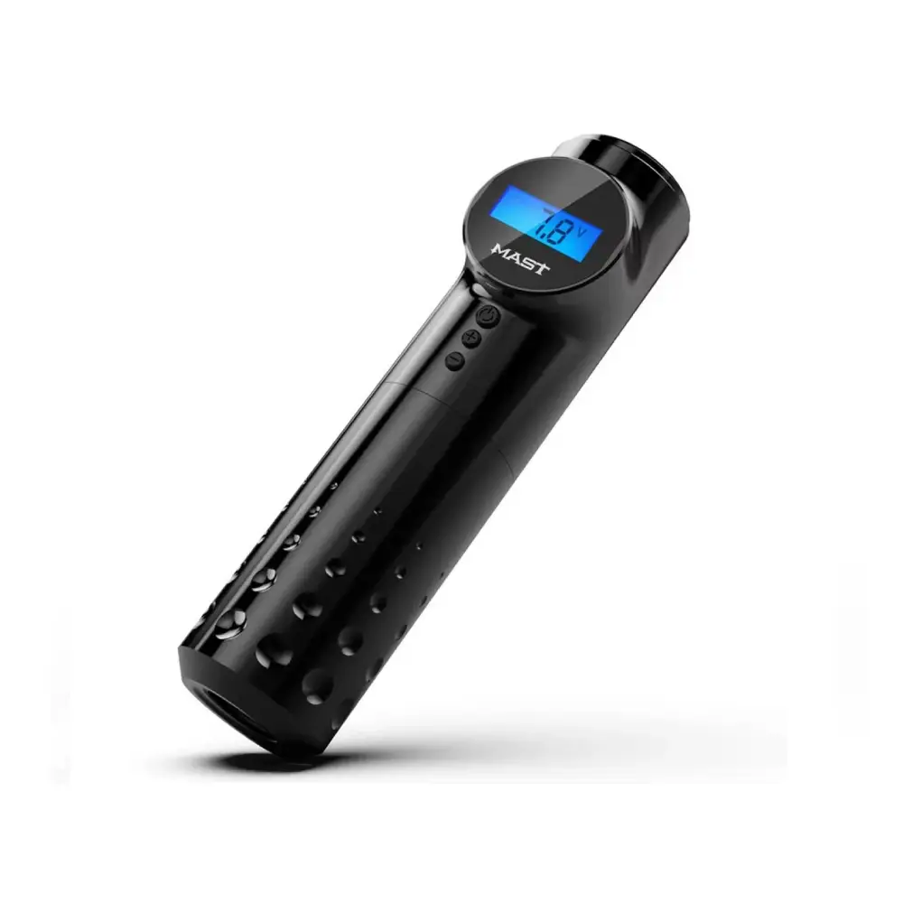 Masina de tatuat wireless tip pen DRAGONHAWK – Mast Archer 3.5mm este echipata cu un ecran digital LCD care afiseaza voltajul si permite ajustarea usoara a acestuia. Se incarca complet in doar 2 ore si ofera o autonomie de pana la 8 ore*. Are un stroke standard de 3.5mm si poate fi folosita atat pentru linii, cat si pentru umbriri. Este foarte usor de protejat cu folie si simplu de folosit. Aceasta masina wireless are un sistem de angrenaj avansat care asigura o functionare lina, delicata si silentioasa. Sistemul contribuie la o vindecare mai buna si este potrivit pentru toate tipurile de piele.